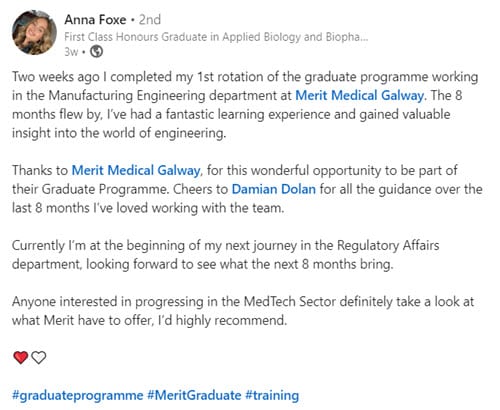 Über ihre Merit- erfahrung sagt Anna:“jder, der daran interessiert ist,在der Medizintechnikbranche voranzukommen, sollte sich unbedingt ansehen,是Merit zu bieten帽子。我能看见你wärmstens我的心。”