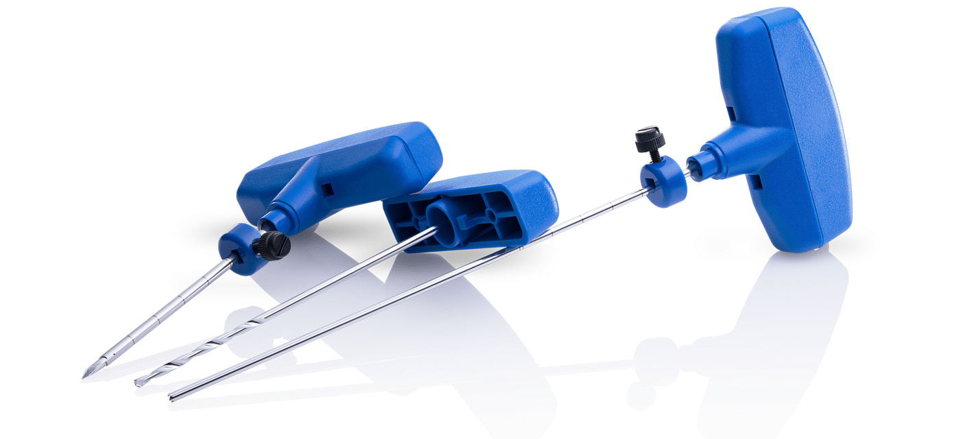 采用直接入路,将导入器送到骨表面,逆时针旋转以减少软组织损伤。然后将介绍人推进,顺时针和逆时针交替旋转,插入骨头。一旦固定在骨表面,套管针尖端的针芯可以更换钻头,该钻头与穿孔套管锁在一起以穿过硬骨。