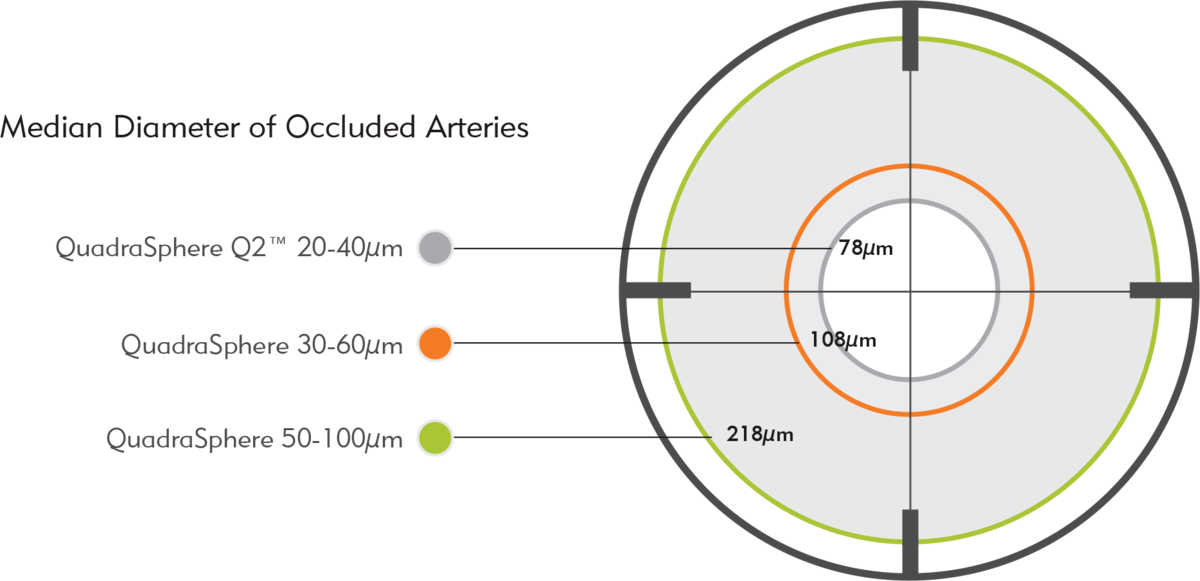 O diâmetro médio in vivo das artérias ocluídas é ificativamente different entre os tamanhos das microesferas QuadraSphere*,比例cionando oclusão direcionada。